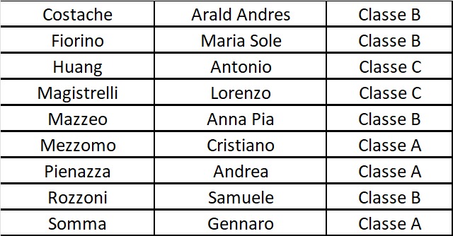 | 2 | MITF13000Q Istituto Tecnico Industriale S. Cannizzaro | Lombardia | MI | Rho | Imbriani | Ennio | Magistrelli | Lorenzo | 5 | Gallo | Francesco | 3 | Bianchi | Elisa | 2 | Damiani | Matteo | 5 |