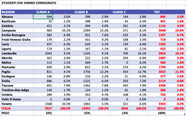 Il numero di studenti ammessi oltre ai campioni regionali per ciascuna Classe di Concorso è stato determinato in base al numero effettivo di partecipanti alle Finali Regionali, per un totale di 43 studenti.